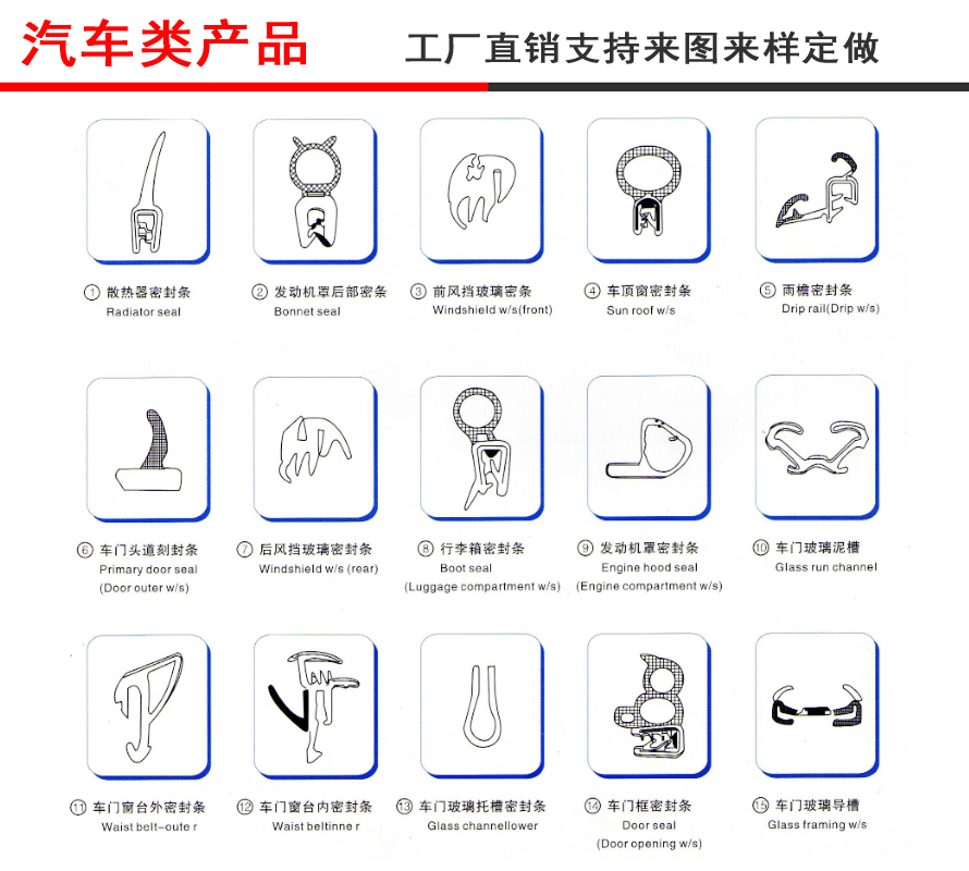 6、按密封件安裝部位(部件)的名稱分類包括:發(fā)動機(jī)蓋密封條(hood),又可分為前部、側(cè)圍和后部,門框密封條(door seal),前、后風(fēng)窗密封條(window screen),